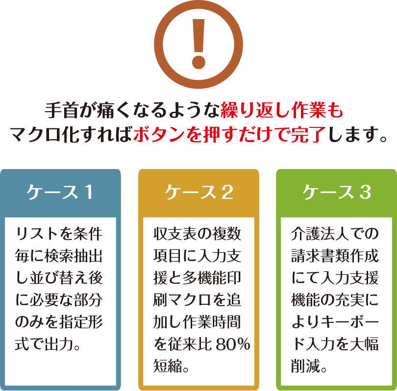大量のデータから一致するものを探し出し、値を追加したり、同じ単語の繰り返し文字入力など、ひとつひとつはわずかな手間とはいえマクロを使った半自動化により作業効率は格段に良くなります。 Excelマクロならではの小回りのきく、その仕事専用の便利なツールにより、繰り返し作業の大変さとケアレスミスから解放されます。