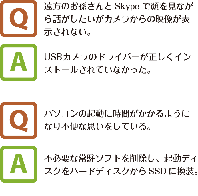 「便利と評判だから使ってみたいけれど設定がうまくいかなかった」「新しい部品を試してみたいがきちんと動くだろうか」「ハードディスクのバックアップの方法を知りたい」などパソコンお困りごとよろずサポート。パソコンやスマートフォンの使い方はずいぶんわかってきたけれど、新しいソフトや部品を活用する際の不安を解消する手助けをします。